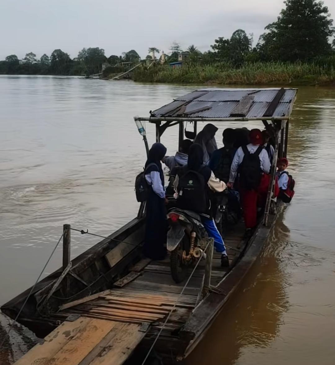 Mereka terpaksa menggunakan perahu untuk menyebrangi sungai karena saat ini belum ada jembatan penghubung antar wilayah.