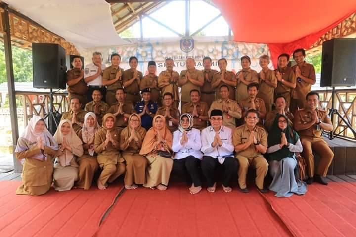 BONTANG, KALTIMOKE — Wali Kota Bontang, Neni Moerniaeni gelar halal bihalal dengan jajaran Pegawai dilingkungan Pemerintah Kota Bontang, pada hari kerja pertama pasca libur lebaran Idul Fitri. Senin 10 Juni 2019