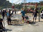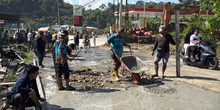 KALTIMOKE, KUKAR — Puluhan warga di Kabupaten Kutai Kartanegara (Kukar) bergotong royong memperbaiki jalan provinsi yang rusak di Desa Loa Kulu Kota,
