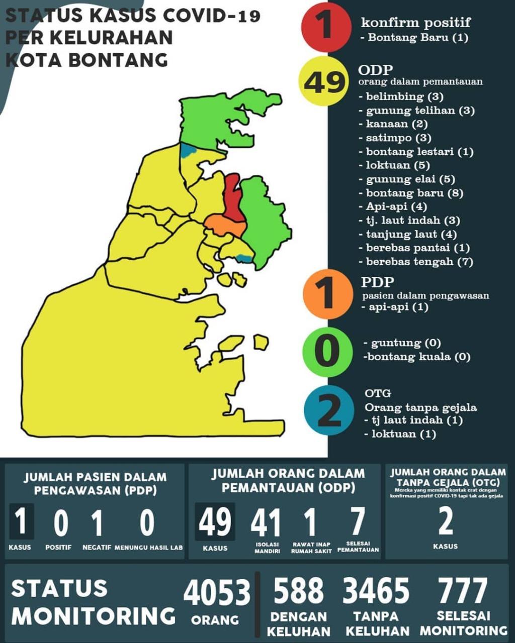 Sedangkan dari 4053 orang dalam monitoring terdapat 588 orang dengan keluhan, 3465 tanpa keluhan dan 777 orang telah selesai monitoring.